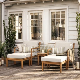 The perfect spot to put your feet up and enjoy the sun with a friend, this garden lounge set includes a small round table, allowing you to place your drink within arm’s reach. The soft, season-resistant cushions invite you to relax and unwind in nature. Crafted from acacia wood, renowned for its durability and scratch resistance, this timeless set is made to last and easy to maintain.