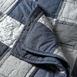 This patchwork throw brings together yarn-dyed stripes and softly printed fabrics, each chosen for the way they work together. Carefully stitched into a layered design and finished with hand quilting, every patch is secured in place for lasting comfort. Pair with the matching cushion for a co-ordinated look.