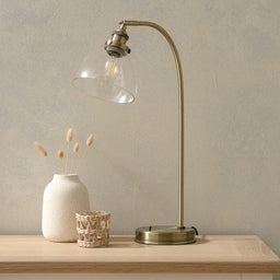 An authentic 'resto' style adjustable table light, finished in antique brass plating with authentic knurled lamp holder details and clear glass shade. Featuring an adjustable knuckle and accessible on/off switch,